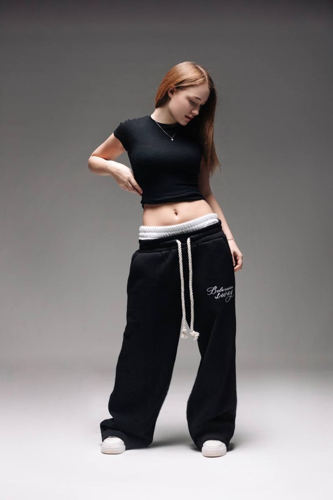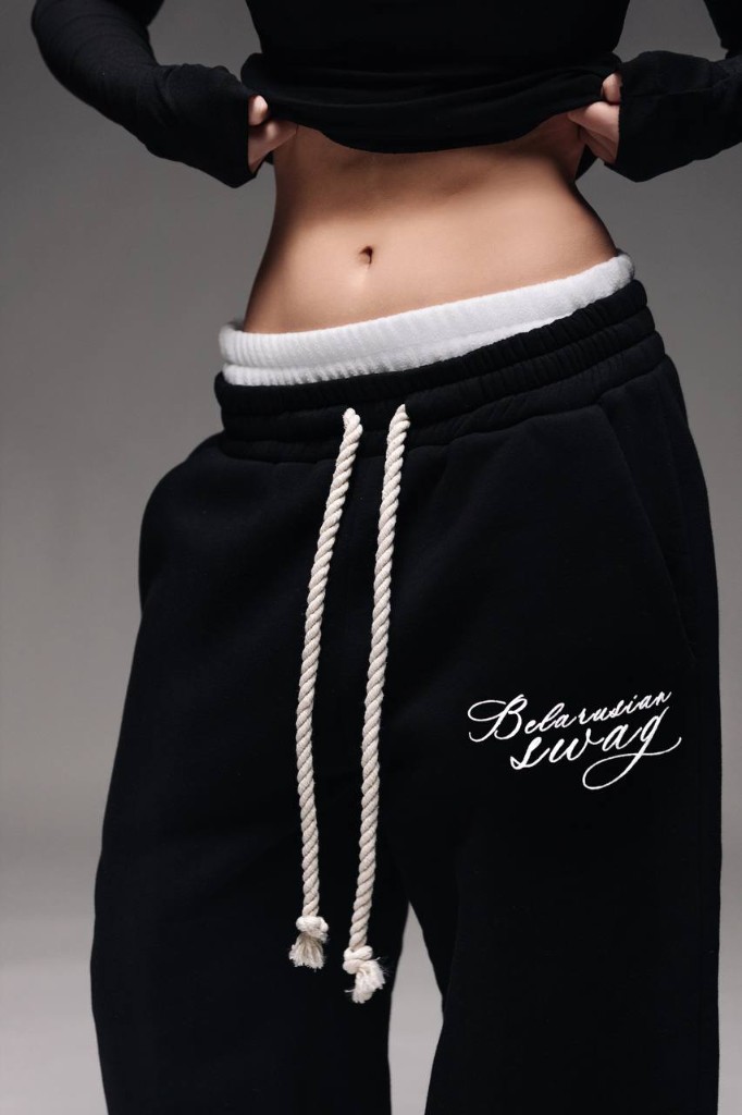 Широкие штаны с контрастным белым поясом и верёвочными шнурками. Вышивка «Belarusian Swag» на левом бедре. Плотный хлопок, oversize fit.